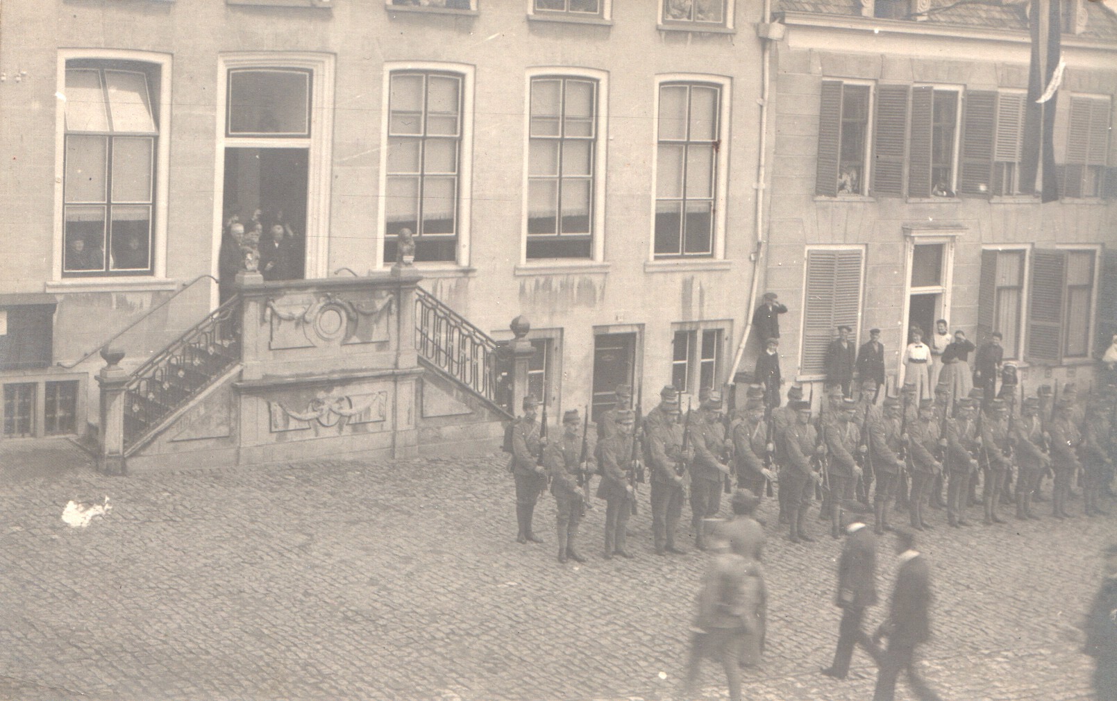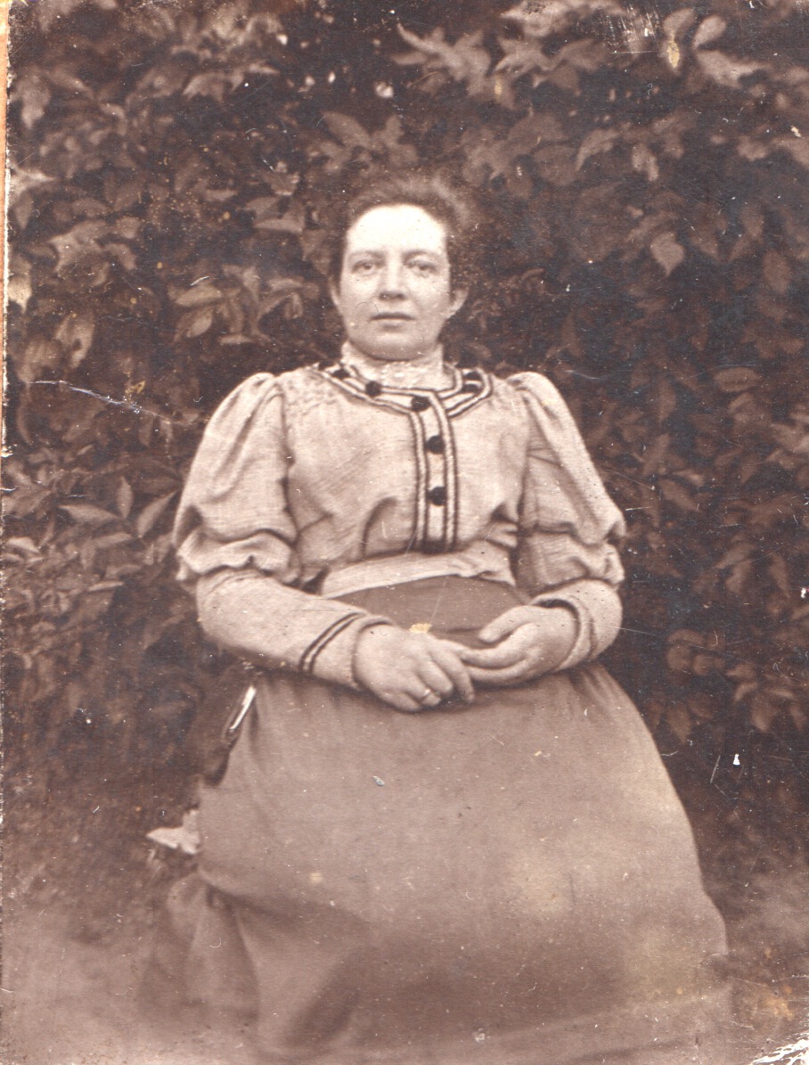 Rectory Axel, August 7 1899; family reunion with family Marie Geesink-Katz. standing left-right. lady in local costume of Axel (servant Jans van der Welle?); Mathilde Hugenholtz-Geesink (1865-1941); oma Geesink-Reuver (1824-1917); Gemma (1891-1960); JBT Hugenholtz (1859-1922); Marie Katz-Geesink; Frida Katz (1885-1963); Karel Fredrik Katz (1883-1942); Johan Rudolf Katz (1880-1938). Sitting left-right Han (JBTh 1888-1973), Gerhard (1889-1969); Co (CAJ 1893-1917); Henk (HSJ (1895-1956).