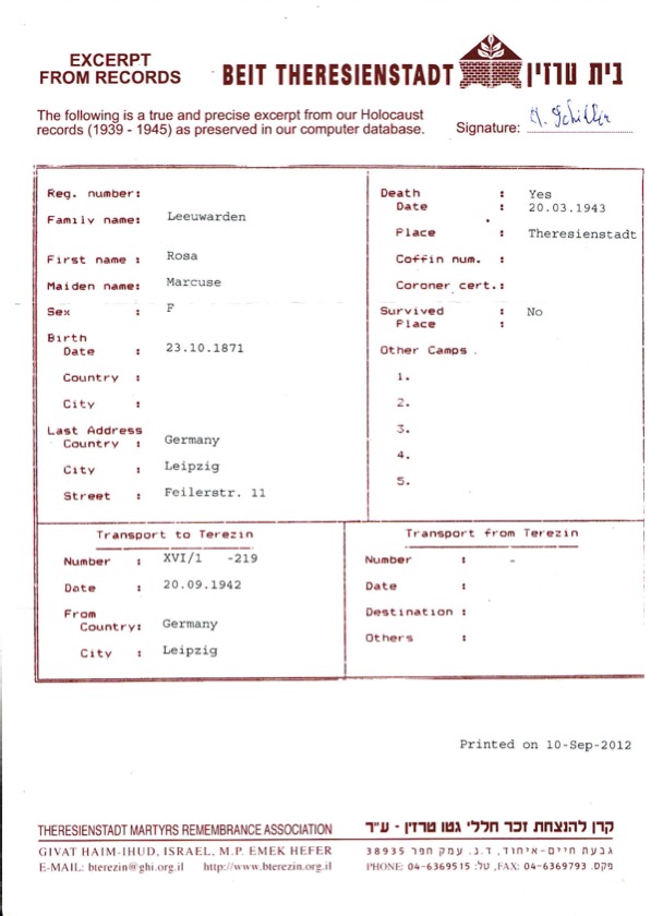 Willy (Wolf is the Jewish equivalent of his name, which he also used) had a beautiful home in the town of Mutzschen, near Leipzig (Germany), where he owned a large fashion store. He was a brother of my great-grandmother Gretchen Lehmkuhl-Leeuwarden. In the First World War, he received an "Iron Cross" for bravery. Thanks to this Iron Cross he was not deported to Auschwitz, but deported with his wife Rosa to Theresienstadt instead. The transport XVI/1, which occurred on September 20, 1942, originated in Leipzig with 877 people in this transport and arrived at the Terezín (Theresienstadt) concentration camp. Tragically, 785 people were murdered, while 92 managed to survive