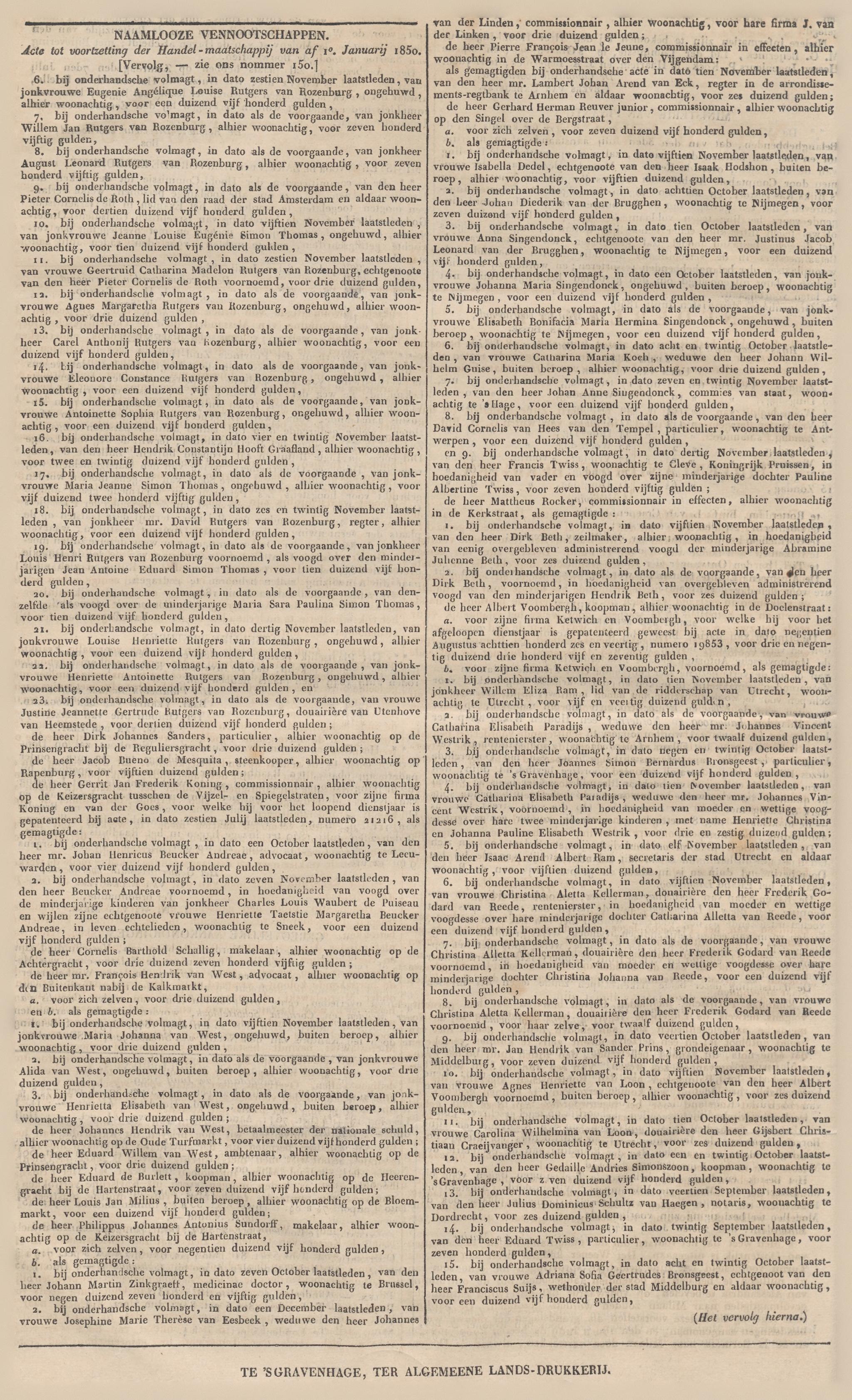 Pagina uit de "Nederlandsche Staatscourant" van 1 juli 1849. Hierin wordt in de rechterkolom het volgende goenoemd: 6. bij de onderhandsche volmagt in dato acht en twintig October laatstleden, van Vrouwe Catharina Maria Koch, weduwe den heer Johann Wilhelm Guise, buiten beroep, alhier woonachtig, voor drie duizend gulden. Opvallend detail is dat haar schoonzoon (ook mijn voorouder hierboven ook genoemd wordt: De heer Gerhard Herman Reuver jnuior, commissionair, alhier woonachtig op den Singel over de Bergstraat, voor zich zelve zeven duizend vijf honderd gulden.